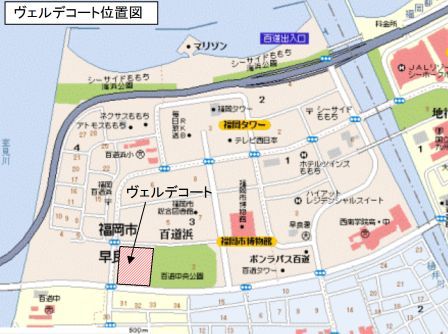 ヴェルデコートは「シーサイドももち」のよかトピア通りに面した集合住宅で、5棟の住居と1棟の商業施設からなる。